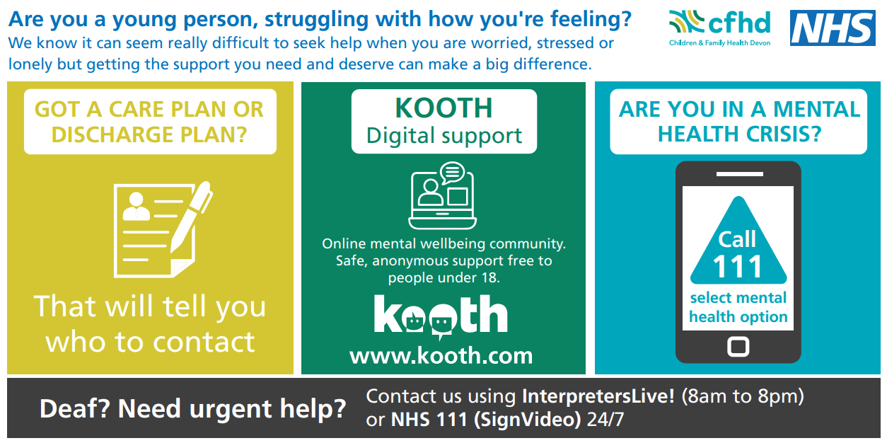 - CAMHS (Child and Adolescent Mental Health Services) – via your GP or CAMHS | DPT and visit Mental health services - NHS for more information.